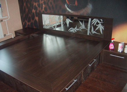из ЛДСП цвета “Венге”, под кроватью расположены ящики на мебельных колесах. Рядом расположены две тумбы с ящиками. На спинке кровати - зеркало с рисунком. Размеры: 3600*2200 (спальное место: 2000*2000). Стоимость: 20000руб.