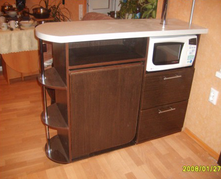 Практичная барная стойка замечательно поместилась на маленькой кухне и соединила гостевую комнату с кухней. Короб барной стойки изготовлен из ЛДСП,столешница влагостойкая в пластике . Под столешницей разместилась микроволновая печь и два ящика, а рядом раскладной столик. В раскрытом виде размер столика 1800*700*750. С лицевой стороны стойки размещаются стеклянные панели с рисунком.