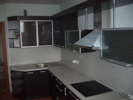 ОБРАЗЕЦ-комбинированные фасады, низ МДФ в пленке ПВХ, верх витражное стекло в алюминевом профиле, влагостойкая столешница, стеновая в цвет, выдвижная система с доводчиками.